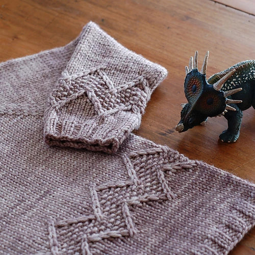 Once the yoke is completed, stitches are put on hold for the sleeves, then the body of the sweater is knit in the round, and features a chevron motif with twisted stitches. The sleeves are worked in the round.